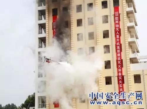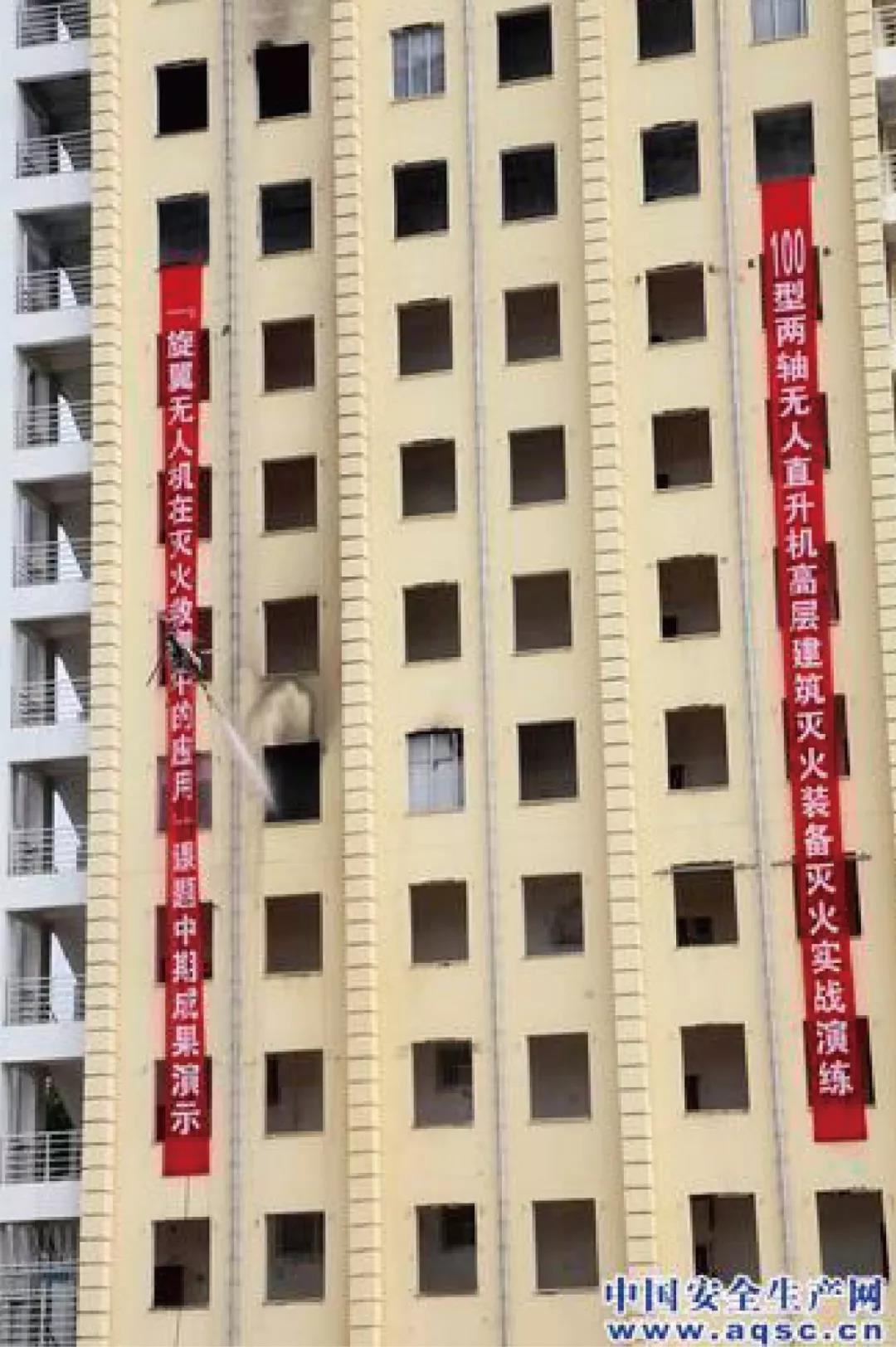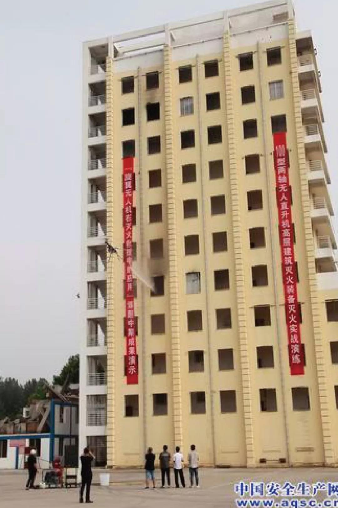 試驗分為三項,即由無人直升機分別攜帶儲壓超細干粉滅火裝置、高壓液體滅火裝置撲滅高層建筑室內火災,攜帶高能滅火劑撲滅高層建筑外墻火災。